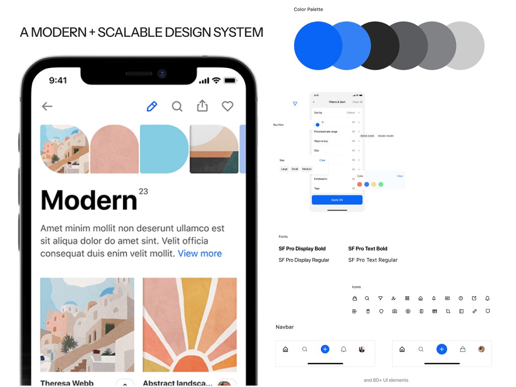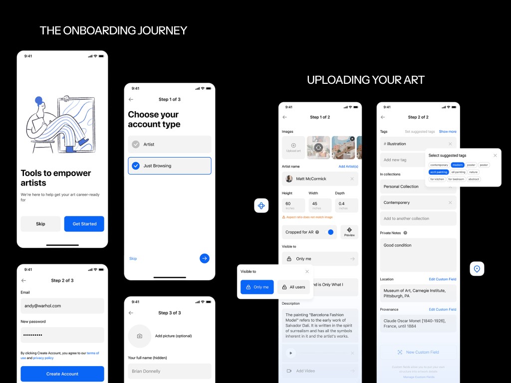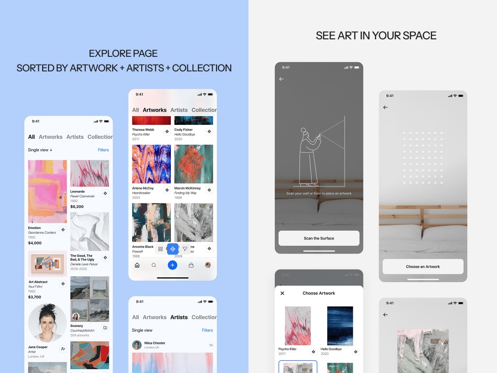 Artly is a mobile app designed to make discovering art effortless and engaging. This project involved a comprehensive branding and UX strategy, balancing visual appeal with seamless functionality. Our work included customer research, competitor analysis, a cohesive component system, custom illustrations, color palette, and iconography, all shaping a distinct brand identity. With a sleek UI/UX design, users can easily explore exhibitions, while personalized recommendations, audio descriptions, and “visualize in your home” features enhance engagement and boost retention.